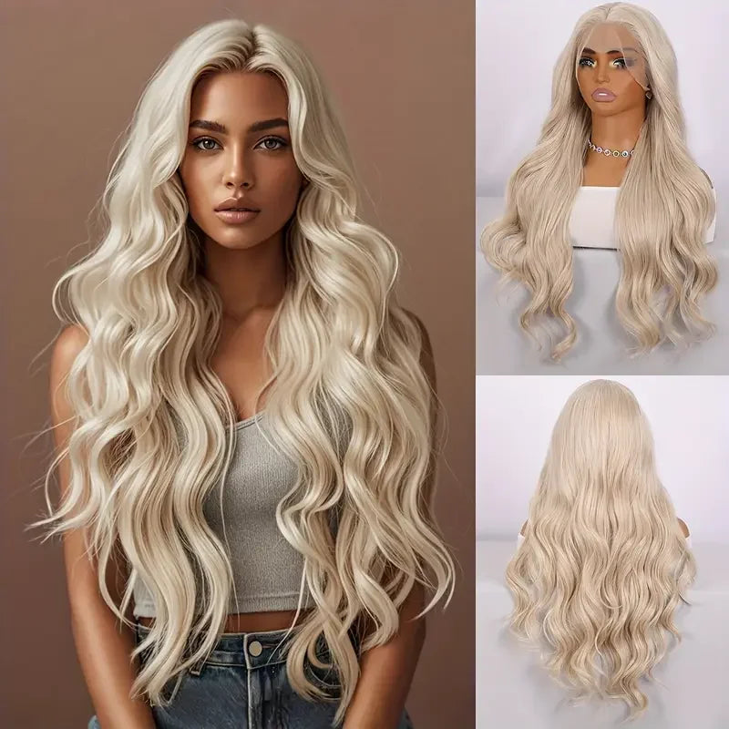 28 Inch Long Blonde Curly 13×4 Lace Body Wave Style 150% Density Very Suitable for Role-playing Synthetic Lace Front Wig.SM9216B